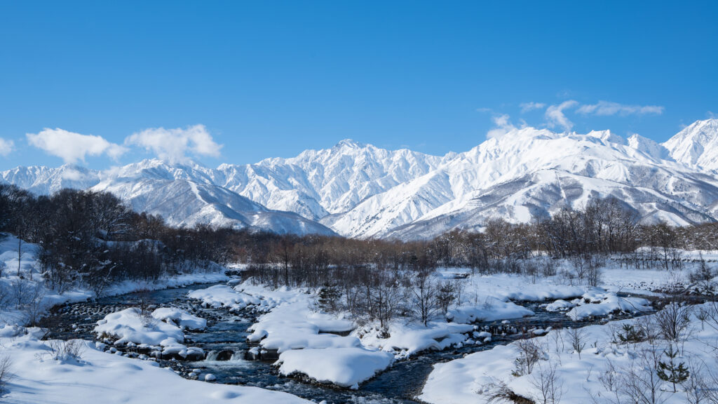 This deep blue sky is called “Hakuba Blue,” and the contrast between the white snow, blue sky, and the ridgelines of the Northern Alps creates breathtaking scenery that captivates visitors from around the world.